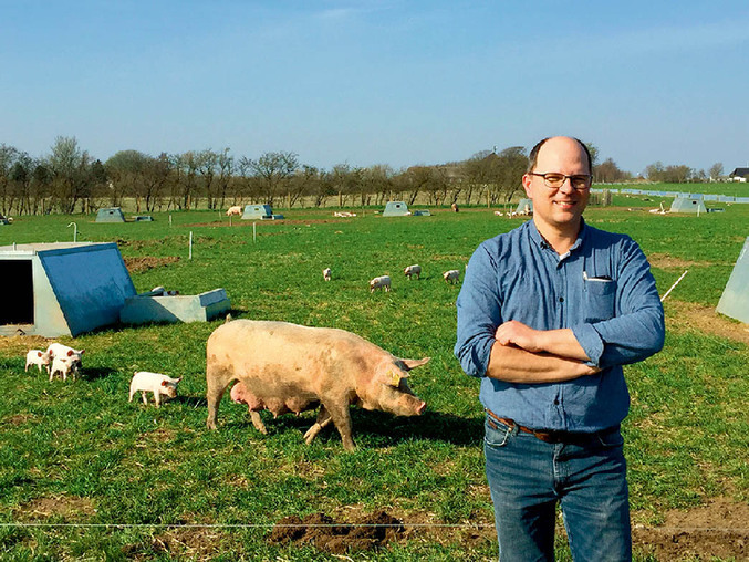 在丹麦西部日德兰半岛上,农场主延森站在他的有机猪养殖场里