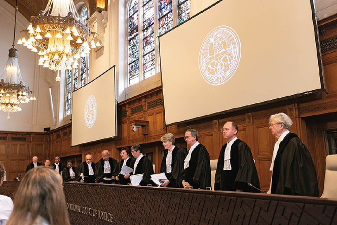 军事行动举行为期两天的听证会,图为当天在荷兰海牙,国际法院法官参加听证会