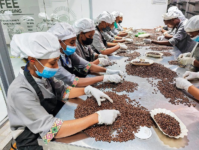 6月8日,工人在埃塞俄比亚首都亚的斯亚贝巴的一家咖啡加工厂分拣烘焙过的咖啡豆(手机照片)