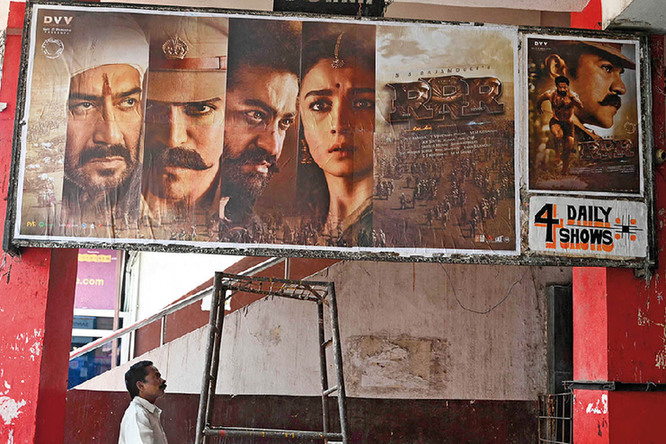 2023年3月13日,在印度海得拉巴的一座影院内,工作人员站在电影《RRR》的海报下面