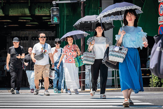 6月14日,行人走在日本东京银座街头
