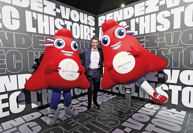 4月17日,巴黎奥组委主席托尼·埃斯坦盖在庆祝活动中与巴黎奥运会和残奥会吉祥物合影留念