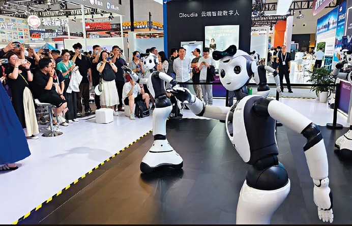 7月5日,在上海举行的2024世界人工智能大会上,一家人工智能公司推出的“具身智能本体”跳舞机器人,吸引观众前来参观