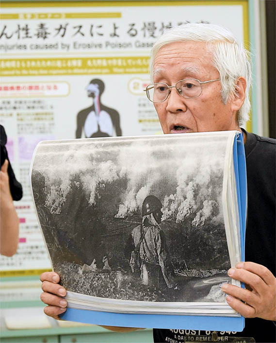 “毒气岛历史研究所”事务局长山内正之展示当年侵华日军在中国战场使用毒气弹的图片资料