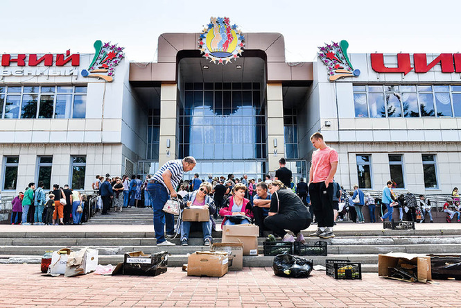 8月14日,在俄罗斯库尔斯克市,来自俄乌边境地区的居民领取物资