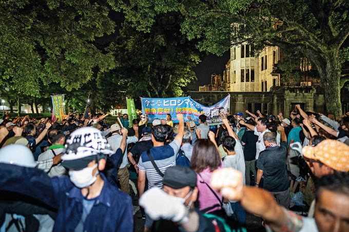 8月5日晚,民众在日本广岛和平纪念公园举行抗议集会,