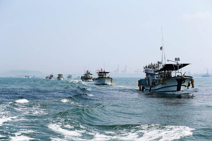 2023年8月14日,悬挂横幅标语的渔船在韩国仁川沿岸码头海域进行海上游行,抗议日本核污染水排海