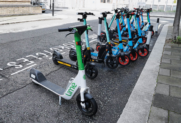 这是2021年8月9日在英国伦敦市中心拍摄的一处电动滑板车租赁点