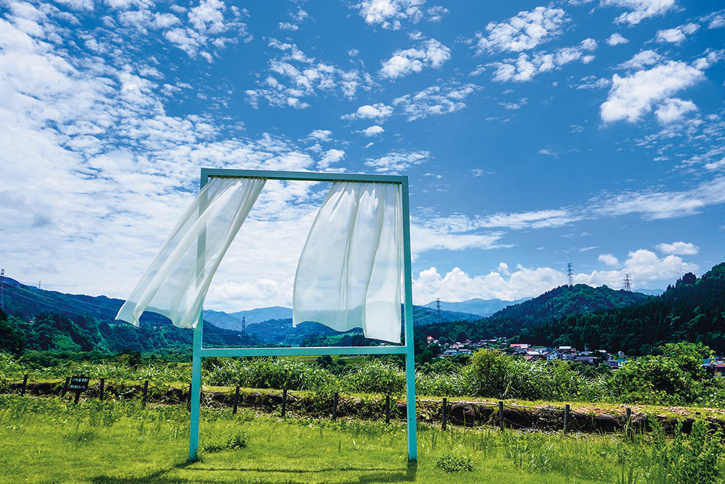 越后妻有地区地震频发,艺术家内海昭子的作品《为了许多失去的窗户》是一扇挂着窗帘的窗框,矗立在一座小山丘上。站在特设的观赏台上,可以通过这扇窗眺望乡村的四季风景,而“失去的窗户”象征着无数地震中损毁的窗户,它不仅是对地震灾难场景的一种隐喻,也承载着人们对于地震的深刻记忆与情感。