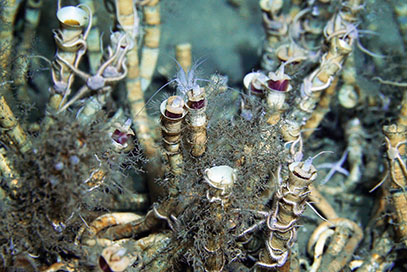 冷水珊瑚不需要阳光,生长缓慢,一年只长1毫米。它主要生活在200~1000米深、4~12℃的冷水里,尤其是在有油气或“可燃冰”的甲烷泄出的地方,可以在海底形成最高35米、长13公里的“丘”。深海冷水珊瑚主要以水中的浮游生物和从表层沉降下来的有机质颗粒为食。这些冷水珊瑚主要形成树木、羽毛、柱状或扇形的小树丛,海绵、海葵、海参、虾蟹等生物依附其中生活。因此,冷水珊瑚林又被誉为“海底森林”。