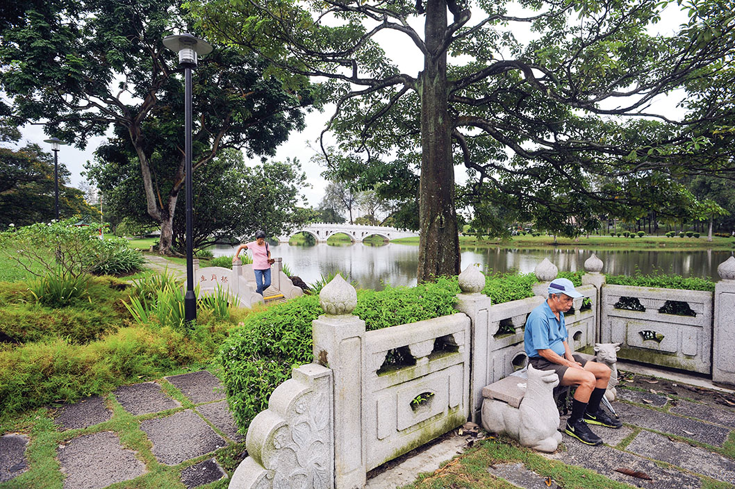 两位老年人在位于新加坡西部的裕华园一角休闲