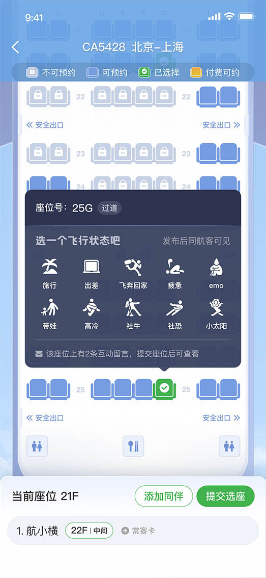 航旅纵横非常重视旅客情绪价值的满足,为让旅客的出行体验更加丰富多彩,推出了“无网聊天室”“机上掼蛋”“飞行状态”等多种功能。“我们的APP上会提供一些显示状态的标签,比如说‘高冷’‘社牛’等。有一个报道特别有意思,说是一名乘客选了‘带娃’状态,结果机上座位旁空无一人。原来大家都怕小孩吵闹,纷纷躲避。”薄满辉笑着说。