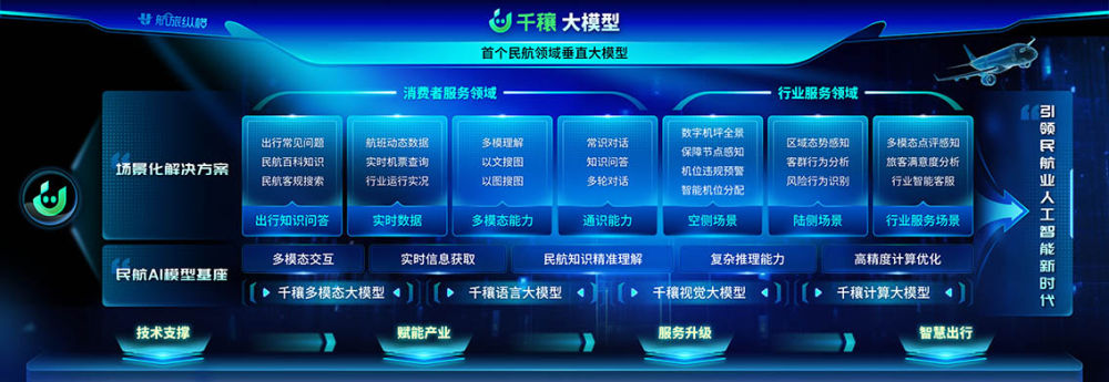 基于深厚的技术积累,中航信移动科技推出了民航首个垂直领域大模型“千穰”,并顺利通过中央网信办生成式人工智能服务备案。“千穰”大模型融合了视觉大模型、语义大模型、语音大模型和计算大模型,为智慧出行、智慧空管、智慧监管和智慧机场四大维度提供了全面的解决方案,满足机坪机位、航站楼、旅客服务、地空对话等多种应用场景的运行、服务和监管需求。