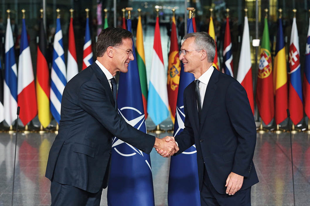 2024年10月1日,在位于比利时布鲁塞尔的北约总部,北约新一任秘书长马克·吕特(左)和前任秘书长斯托尔滕贝格握手