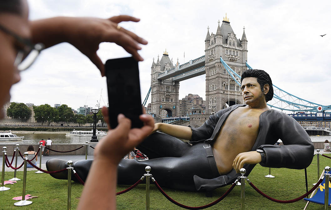 在英国伦敦,人们用手机拍摄美国演员杰夫·高布伦的雕像