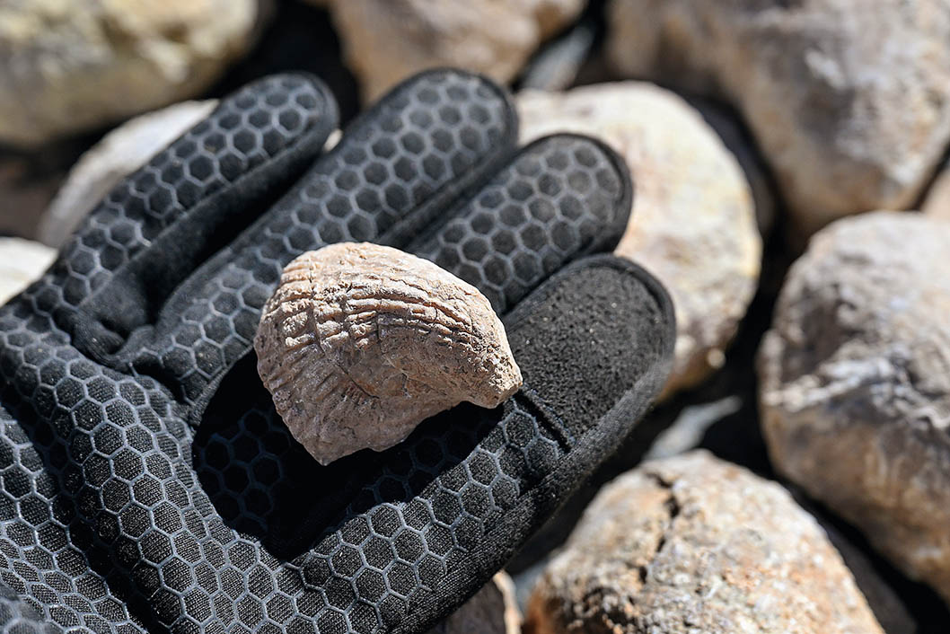 在新疆克孜勒苏柯尔克孜自治州乌恰县古海遗址贝壳山,专家学者在查看贝壳化石