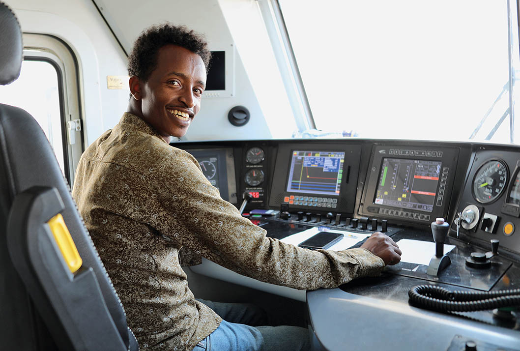 2022年9月19日,在亚吉铁路吉布提那噶德站,一名司机在列车内做发车前的准备