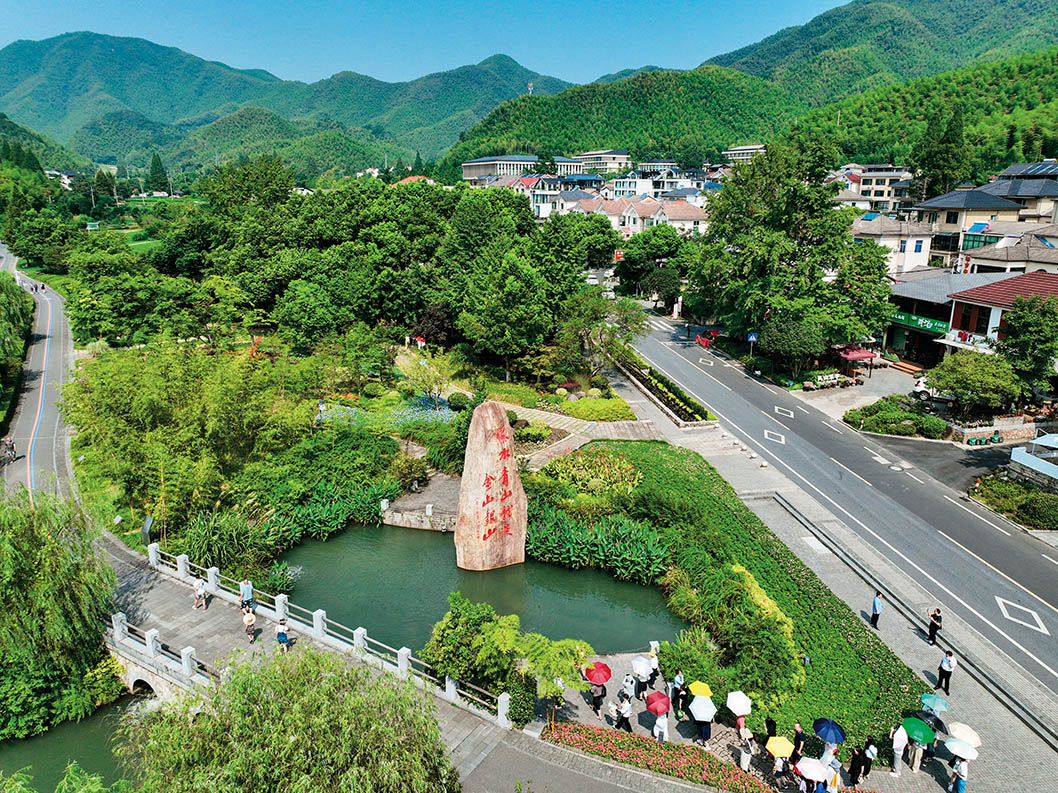 游客在安吉余村的绿水青山间参观(无人机照片)