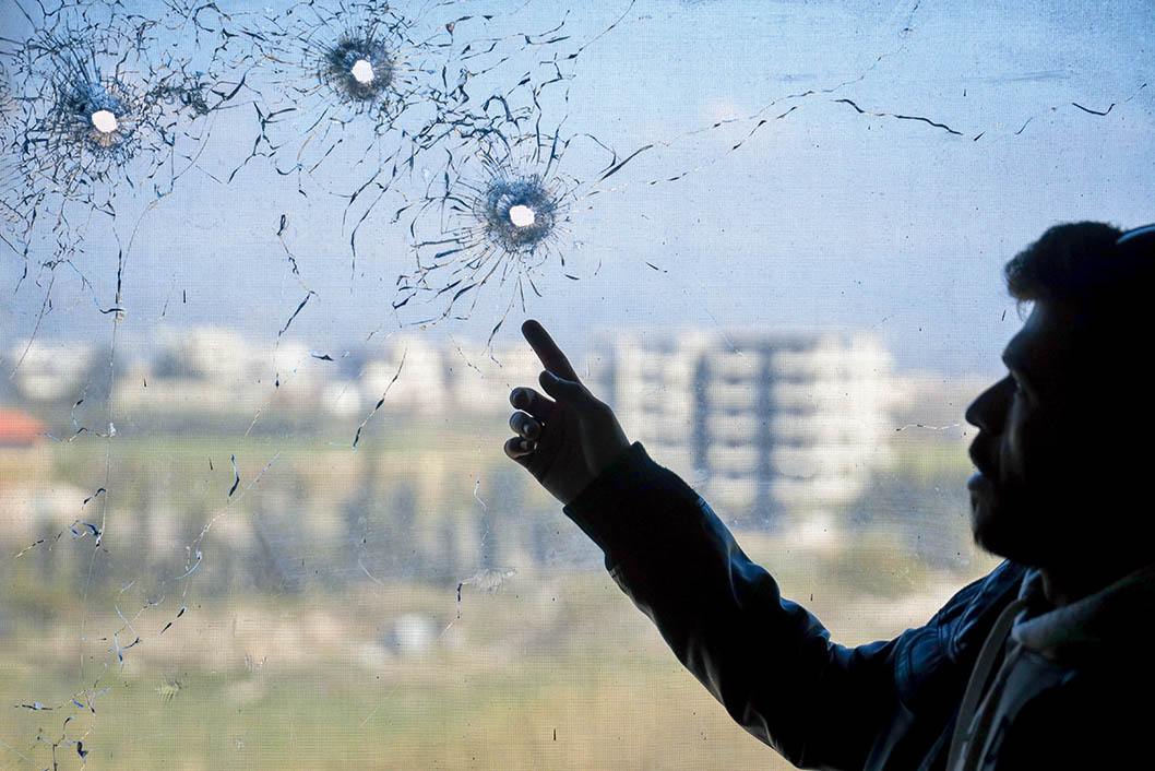 3月10日,在叙利亚拉塔基亚杰卜莱一家医院,一名男子查看玻璃上的弹孔