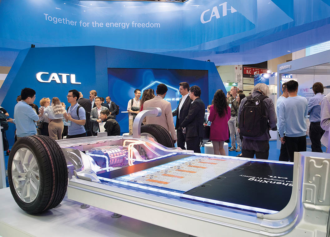 这是2023年9月5日在德国慕尼黑国际车展的宁德时代展区拍摄的神行超充电池展品
