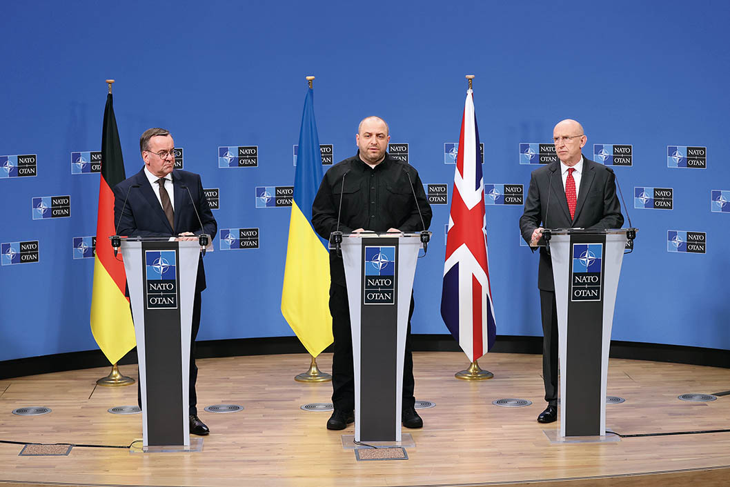 4月11日,在位于比利时布鲁塞尔的北约总部,德国国防部长皮斯托里乌斯、乌克兰国防部长乌梅罗夫和英国国防大臣希利(从左至右)在乌克兰联络小组国防部长会议后出席新闻发布会