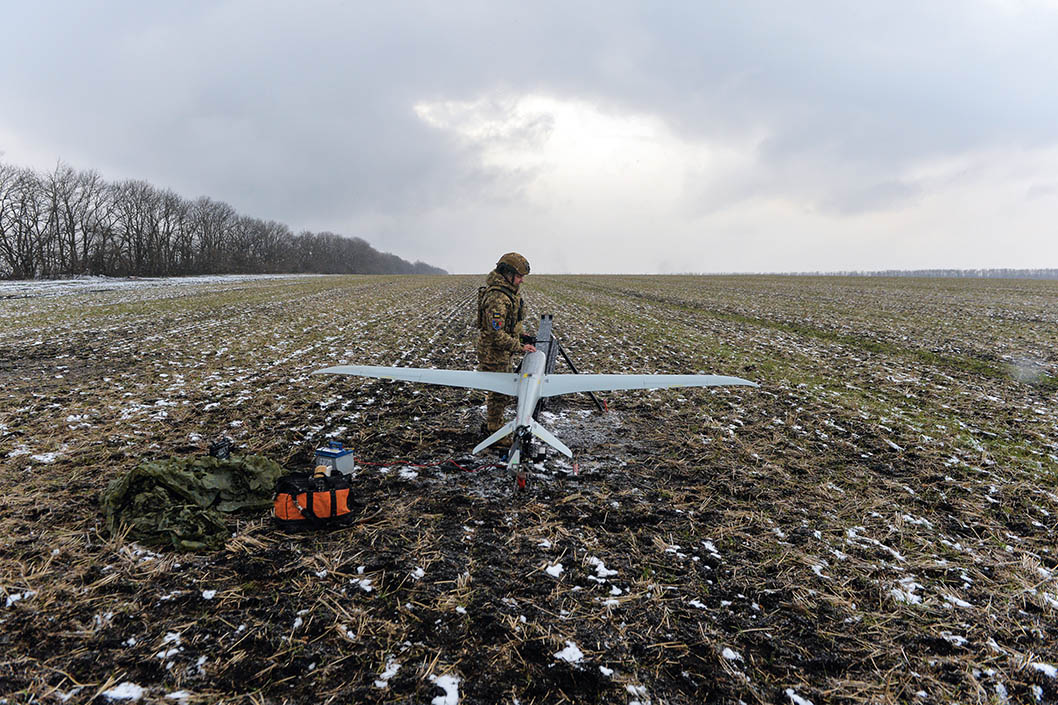 2月5日,在波克罗夫斯克前线作战的乌克兰第25独立空降旅士兵将安装调试好的无人机搬运到发射装置上