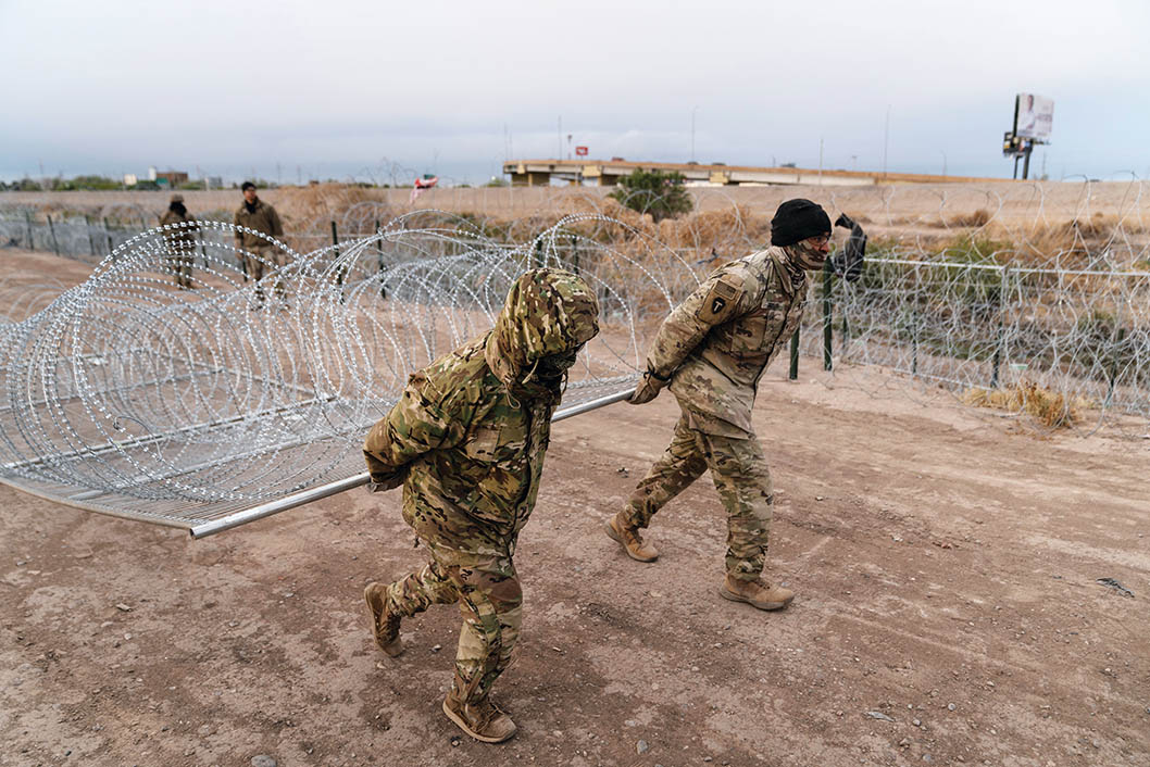 2024年4月2日,在美国得克萨斯州边境城市埃尔帕索,国民警卫队成员正在设立用于隔离移民的栅栏