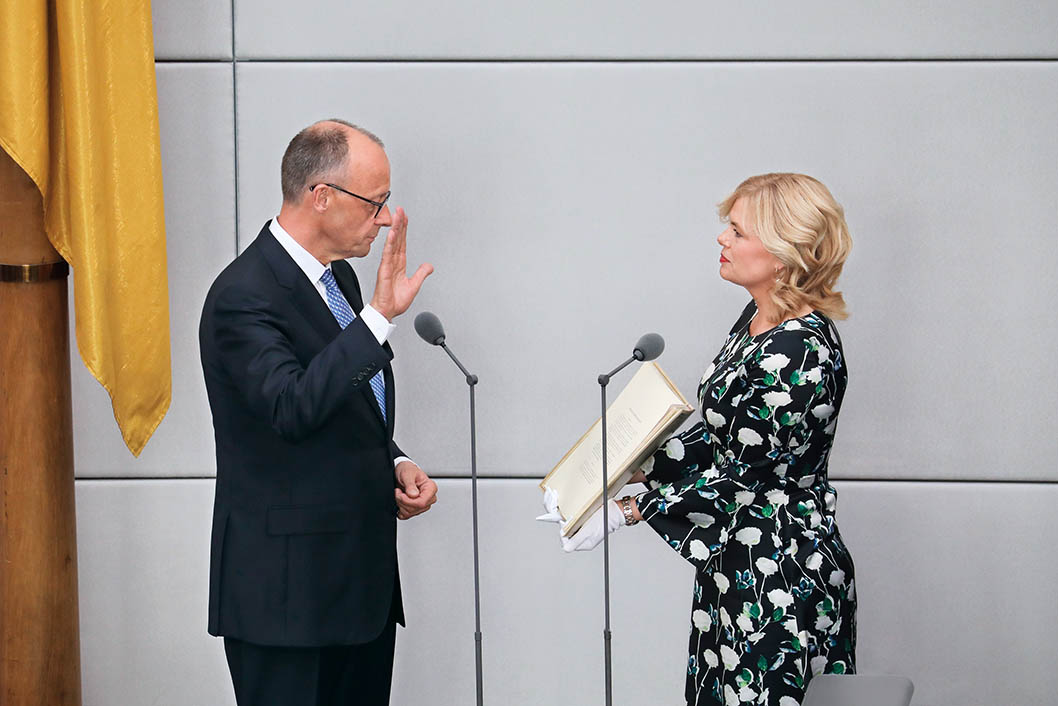 5月6日,在德国首都柏林的国会大厦,默茨(左)宣誓就职