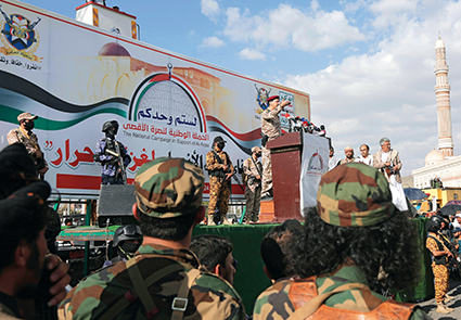 2024年5月3日,也门胡塞武装发言人叶海亚·萨雷亚在萨那举行的一个集会上讲话