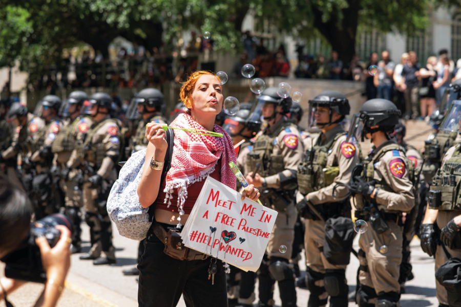 2024年4月29日,在美国得克萨斯大学奥斯汀分校,一名女子参加抗议活动