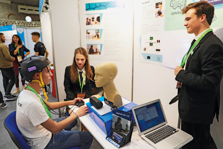 2018年9月15日,在爱尔兰首都都柏林,参赛选手们在第30届欧盟青少年科学家竞赛开幕当天展示科研成果