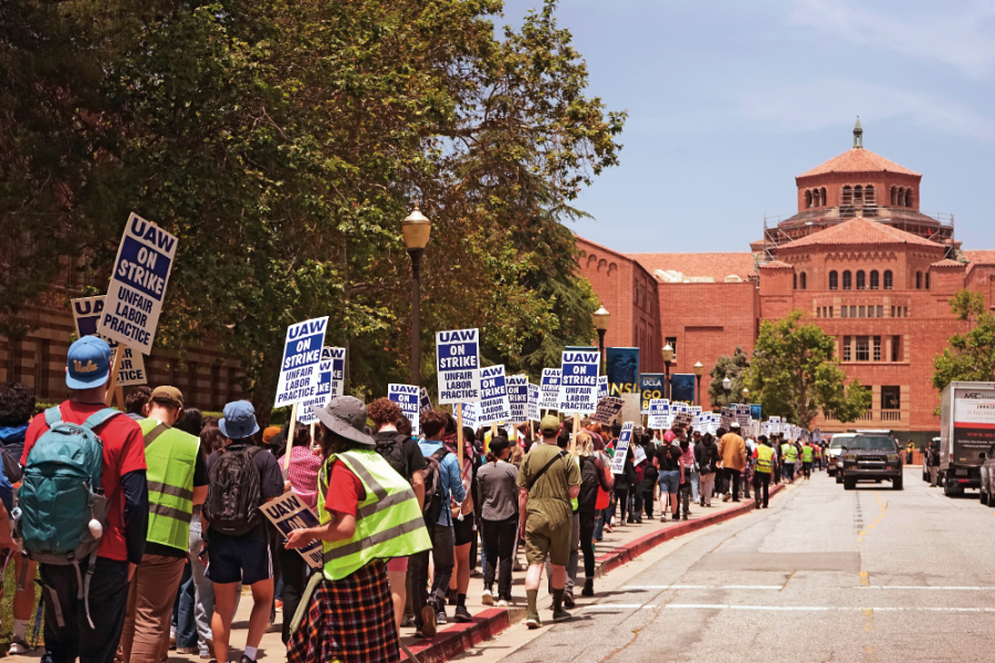 2024年5月28日,学校员工在美国加州大学洛杉矶分校参加罢工,抗议学校对声援巴勒斯坦的反战抗议活动的处置方式