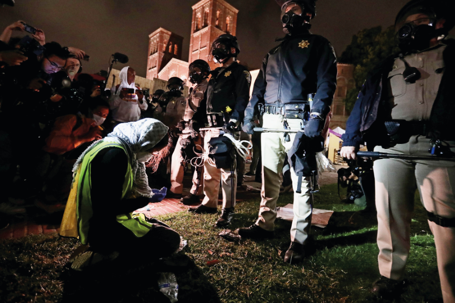 2024年5月1日凌晨,美国加州大学洛杉矶分校一名支持巴勒斯坦的抗议者跪在警察前