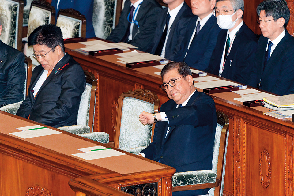 2024 年 10 月 9 日,日本首相石破茂(前右)出席在首都东京举行的众议院全体会议