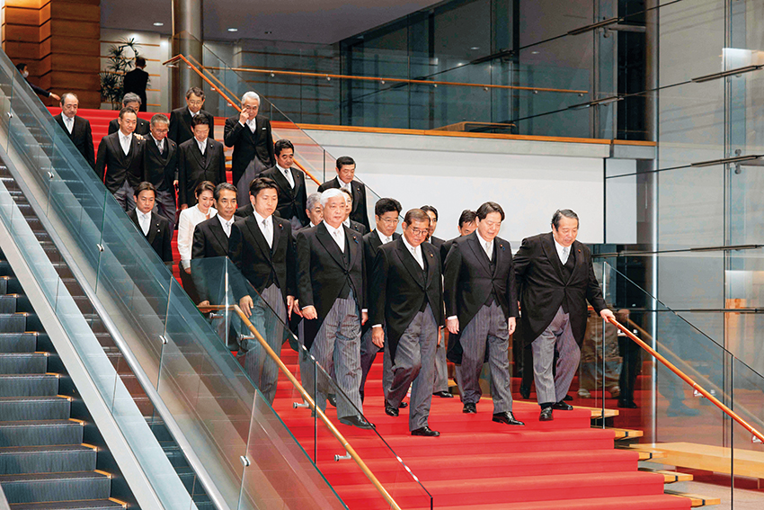 2024年11月11日,日本首相石破茂(前排中左)准备在日本东京的首相官邸率阁僚合影