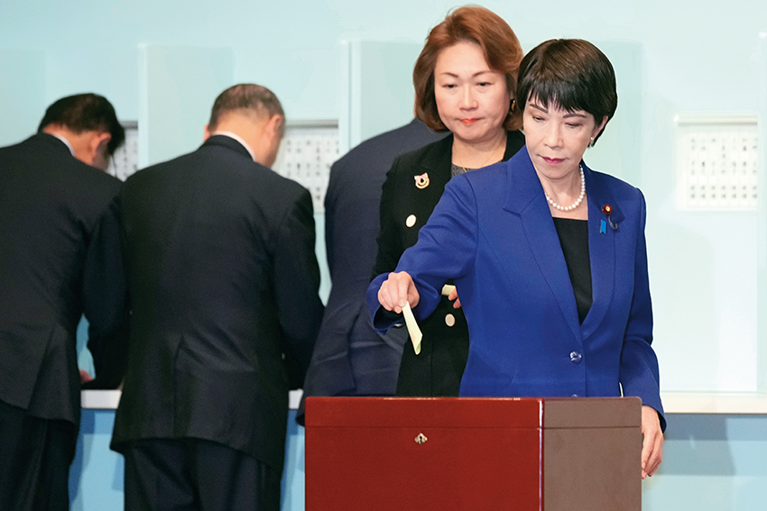 2024 年 9 月 27 日,自民党总裁候选人高市早苗(右一)在日本东京自民党总部进行的自民党总裁选举中投票