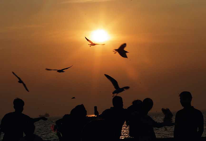1月2日,游客在泰国曼谷郊外的海滨旅游胜地邦普的海边喂海鸥