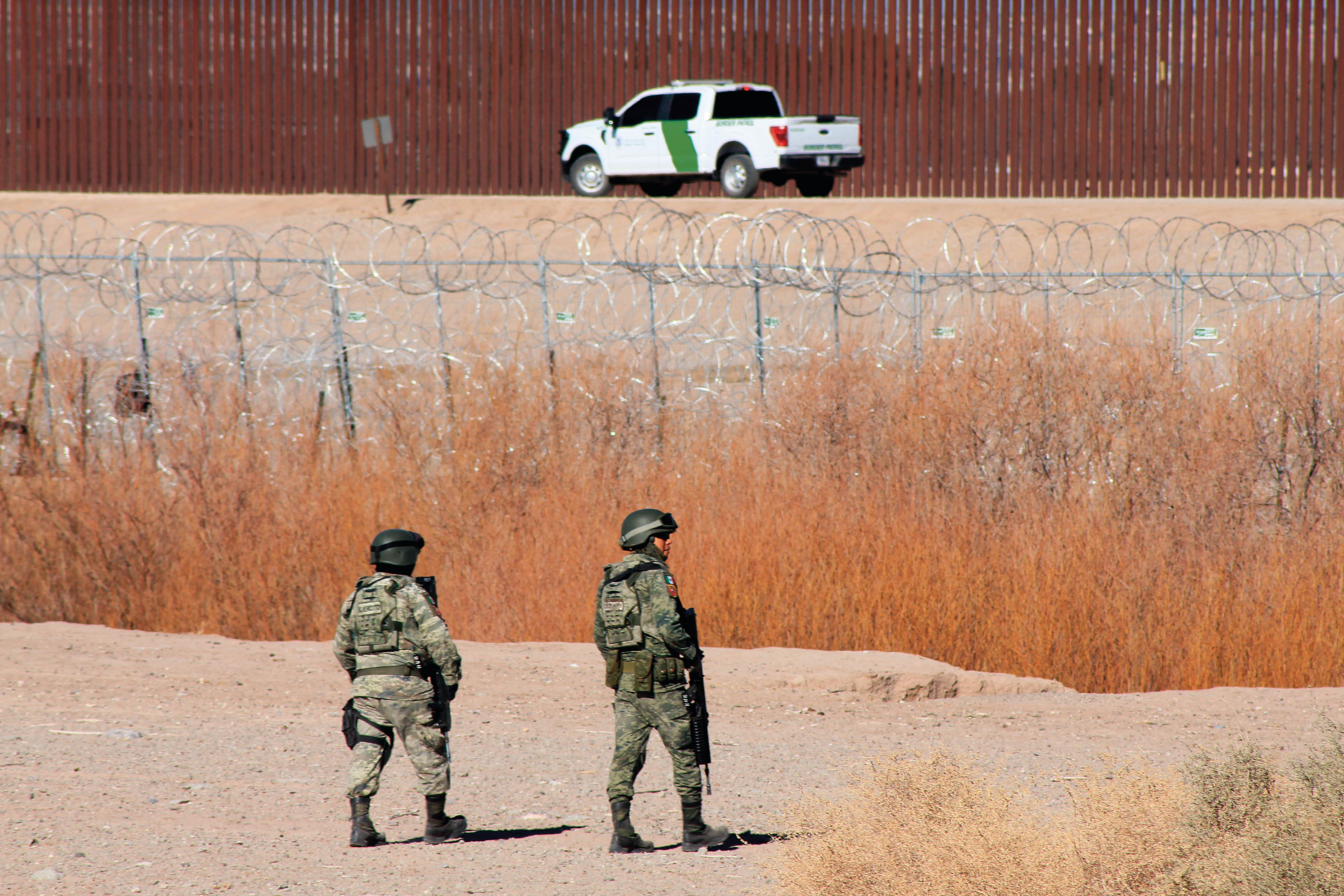 2月6日,在墨西哥奇瓦瓦州华雷斯市,墨西哥军人在墨美边境执行任务