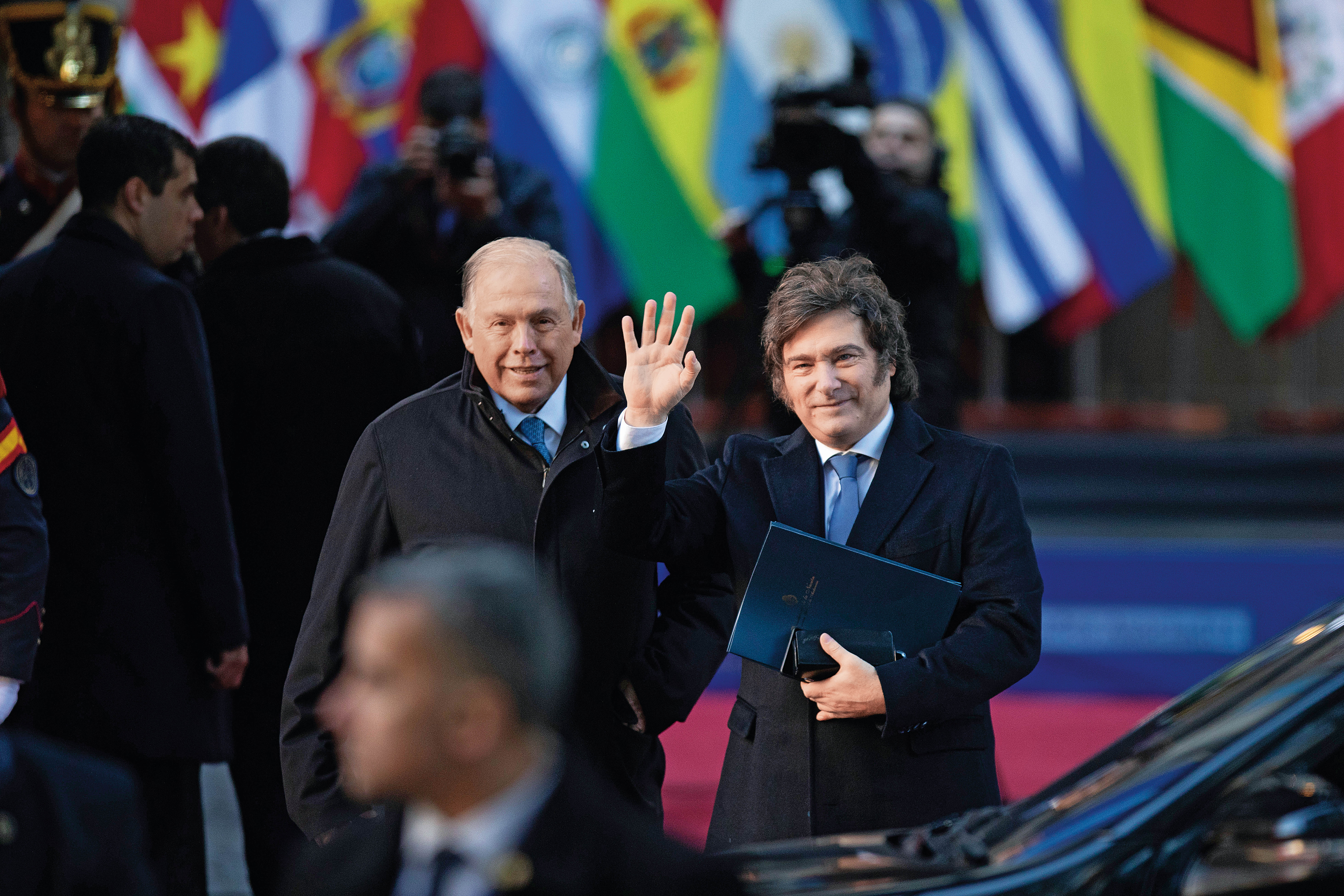 7月3日,在阿根廷首都布宜诺斯艾利斯,阿根廷总统米莱(右)抵达南方共同市场第 66 次首脑会议现场