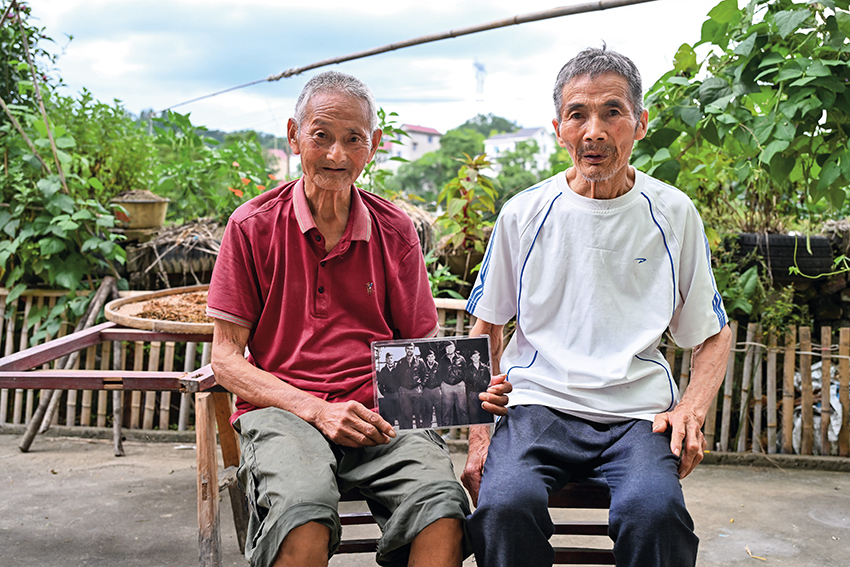 6月18日,毛树居(左)和毛洪根在展示罗斯·威尔德的外孙送给他们的老照片,照片上是杜立特航空队5号机组成员合影,右二为威尔德