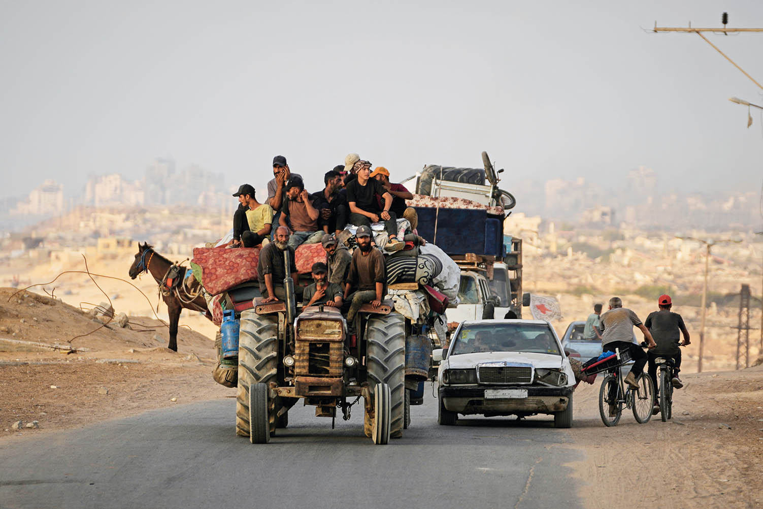 9 月 6 日,巴勒斯坦人携带家当从加沙地带北部撤离,驶向南部