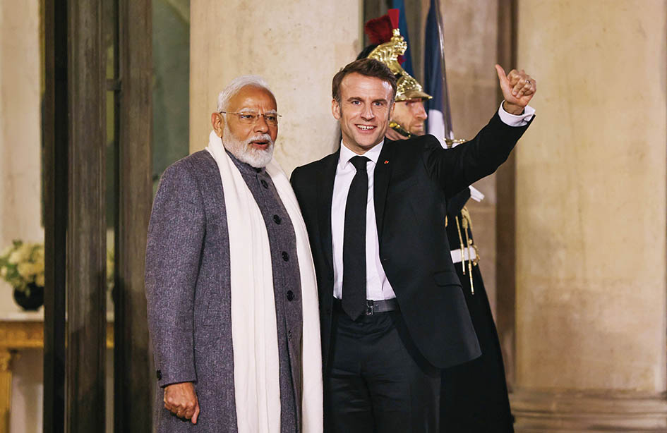 2月10日,在法国巴黎总统府爱丽舍宫,法国总统马克龙(右)与印度总理莫迪准备出席欢迎晚宴。为期两天的人工智能行动峰会10日在法国首都巴黎的大皇宫拉开帷幕