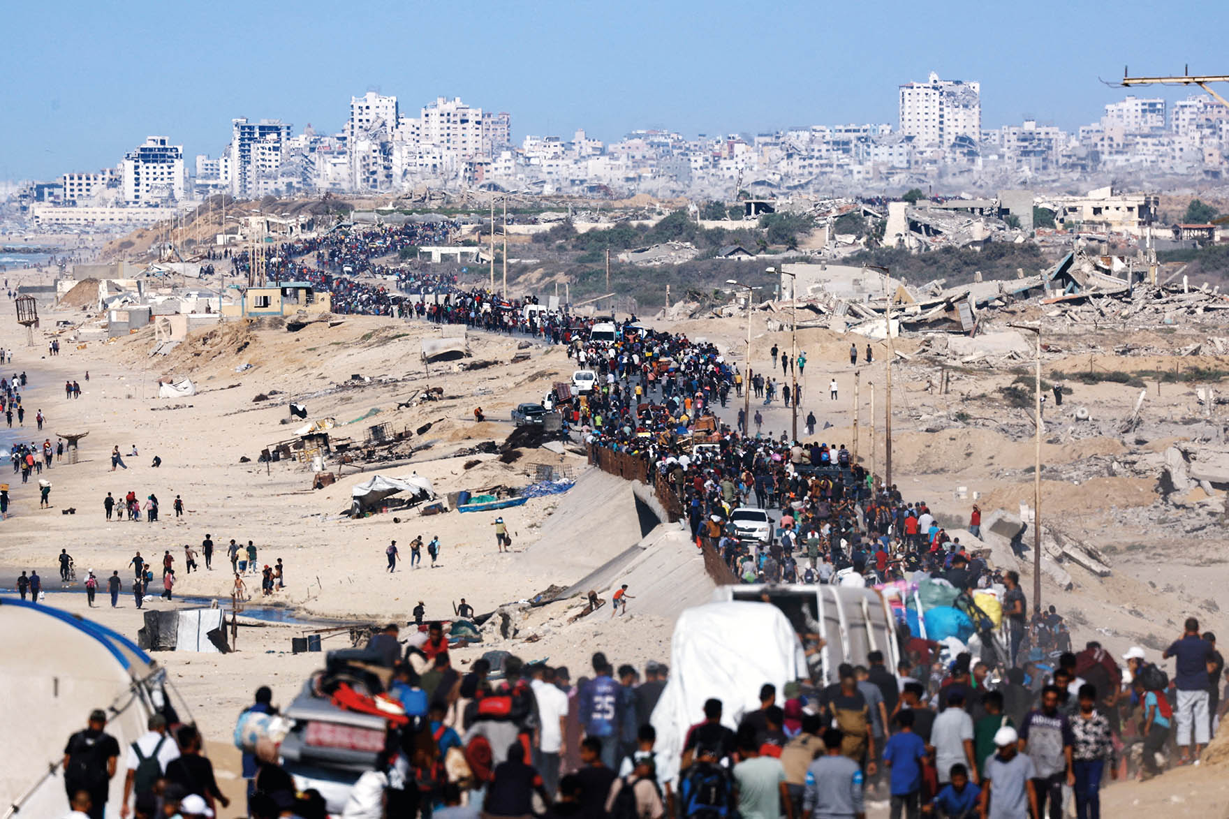 10月10日,在加沙地带中部,流离失所的巴勒斯坦人行进在返回加沙地带北部的路上