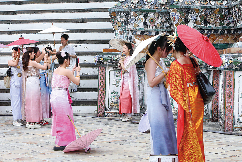 10月9日,游客身穿泰服在泰国曼谷郑王庙景区拍照