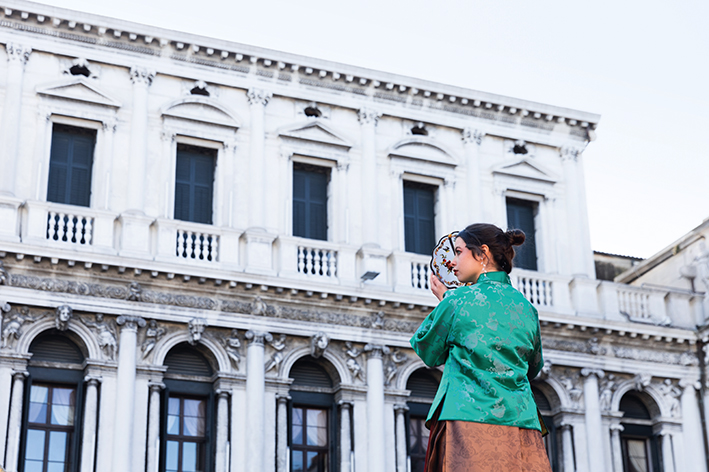 2024 年 2 月13 日,在意大利威尼斯狂欢节上,志愿者身着汉服进行表演