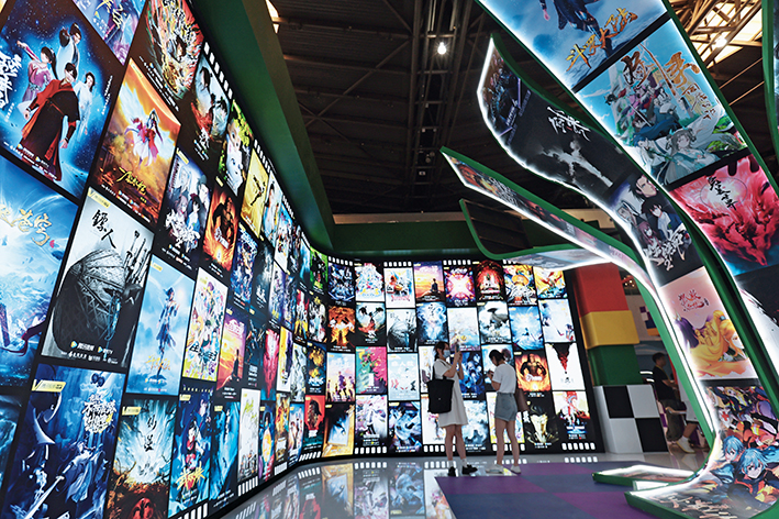 2023 年 7 月 13 日,参观者在腾讯视频展位拍摄。当日,为期四天的第十八届中国国际动漫游戏博览会在上海世博展览馆拉开帷幕