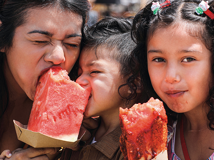 2025 年 6 月 7 日,在美国加利福尼亚州洛杉矶,人们在 2025 加州西瓜节上吃西瓜