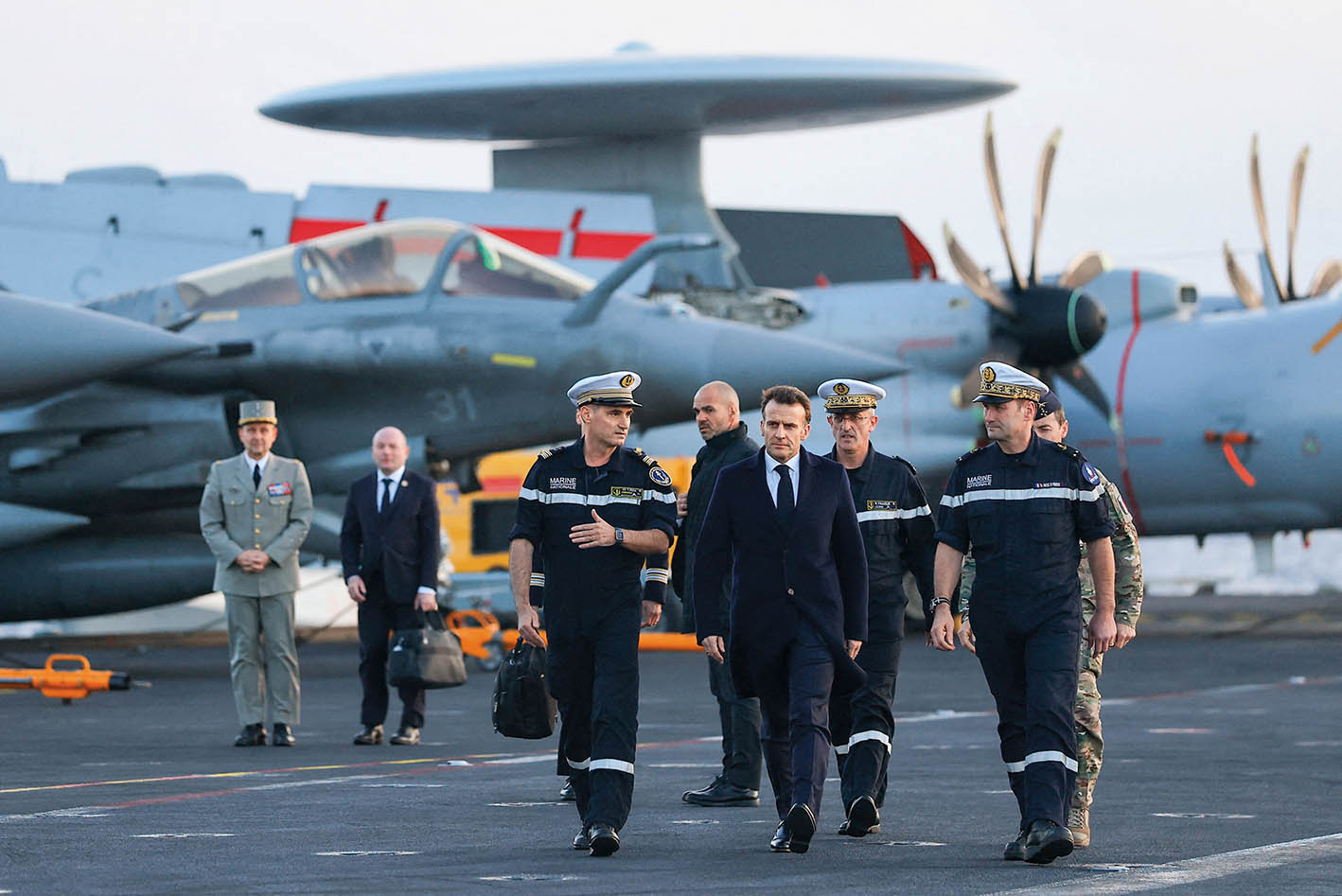 2026年3月9日,法国总统马克龙(前)在访问塞浦路斯期间,视察法国“戴高乐”号航空母舰