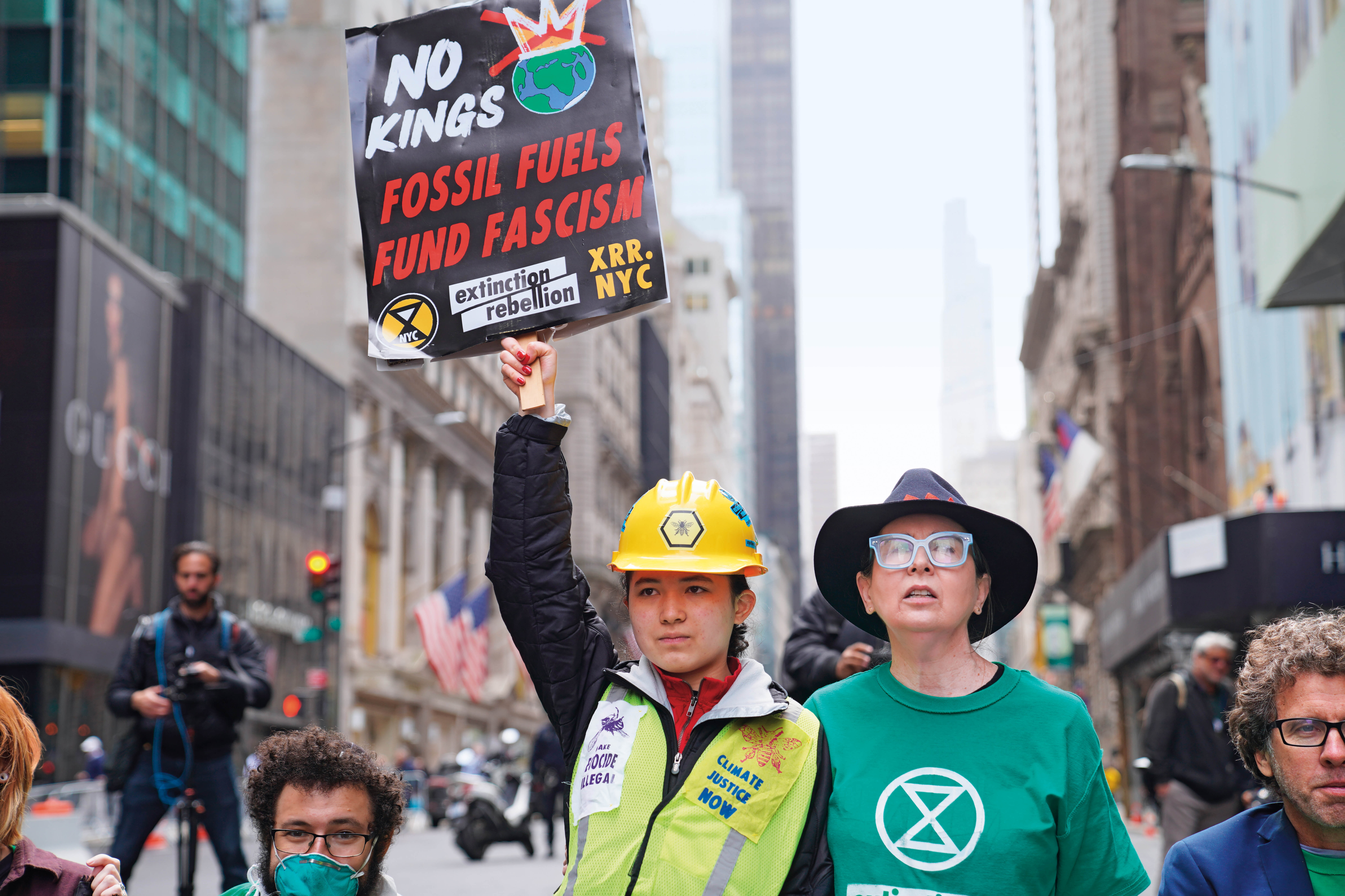 图为当天,人们在曼哈顿参加“地球日”抗议活动
