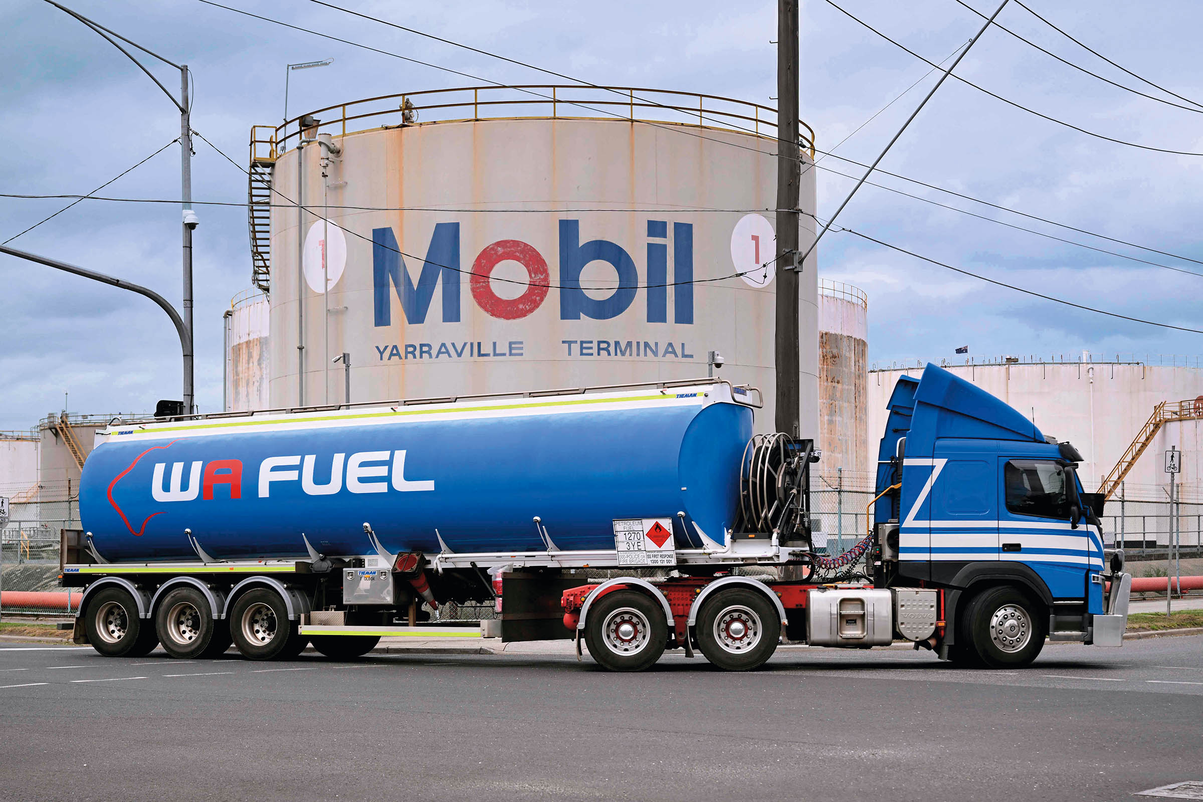 图为当天,油罐车驶过澳大利亚墨尔本郊区的一处燃油配送中心